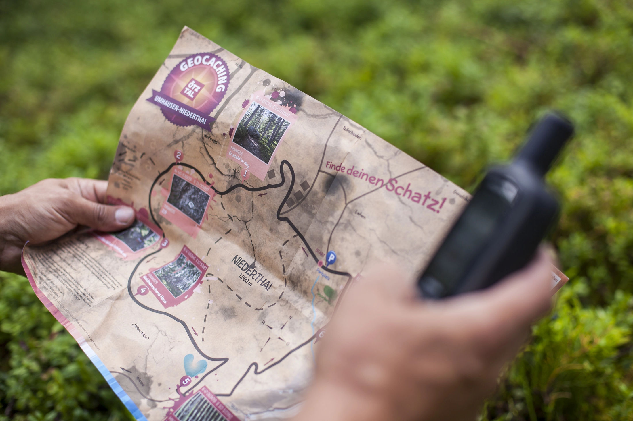 Im Ötztal kann man Geocaching auf zwei verschiedenen Arten erleben. Bei der „Schatzsuche Geocaching“ wird kein GPS-Gerät benötigt. Diese Variante bietet sich vor allem für Kinder an. Alles was man braucht sind kleine Schatzkarten, die bei den Informationsbüros von Ötztal Tourismus erhältlich sind. Darin sind Hinweise zu den versteckten Schatzkisten entlang der Route vermerkt.