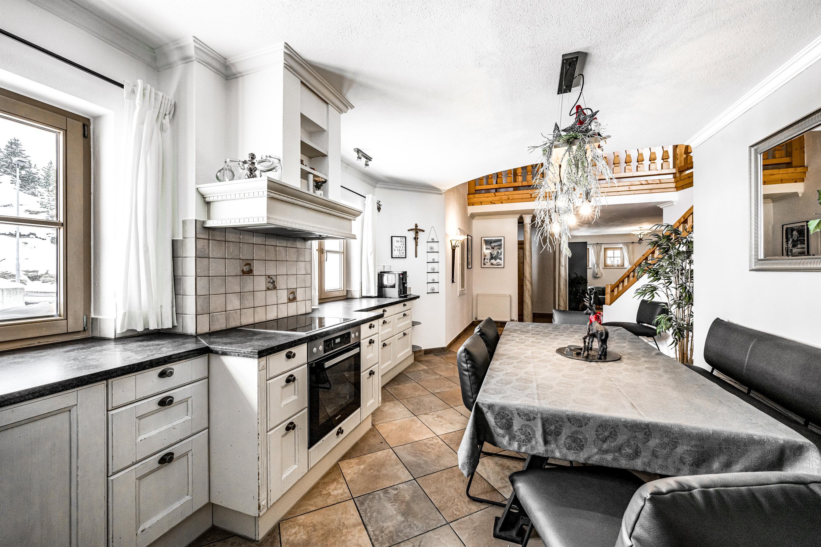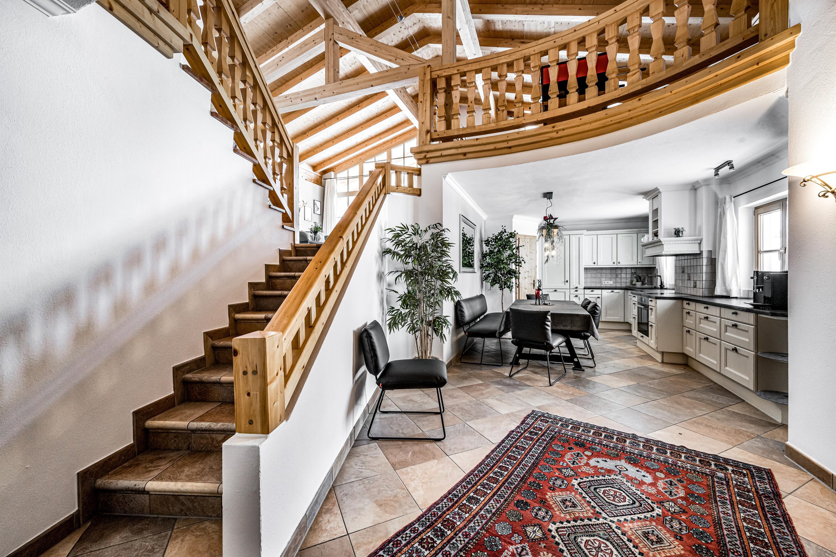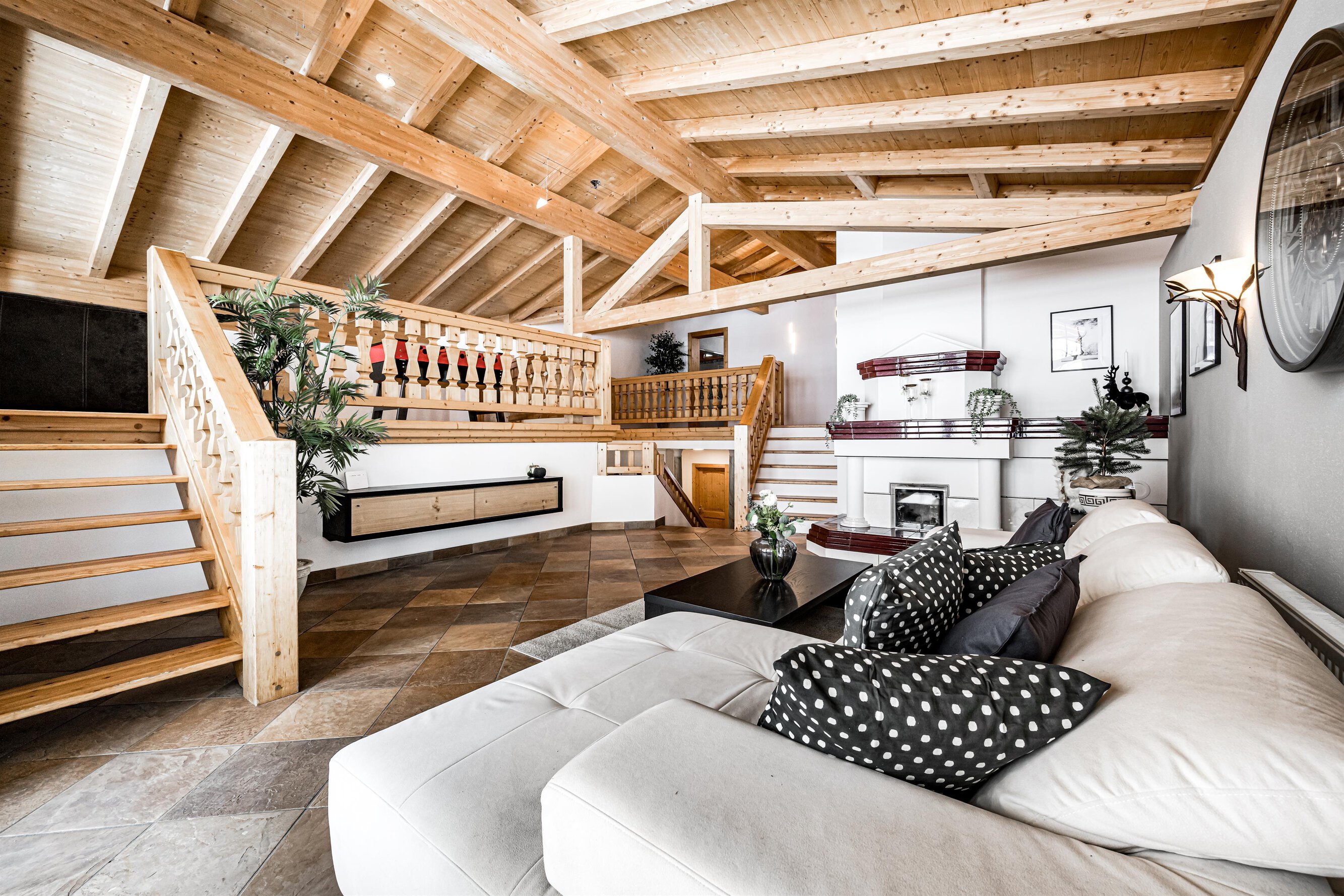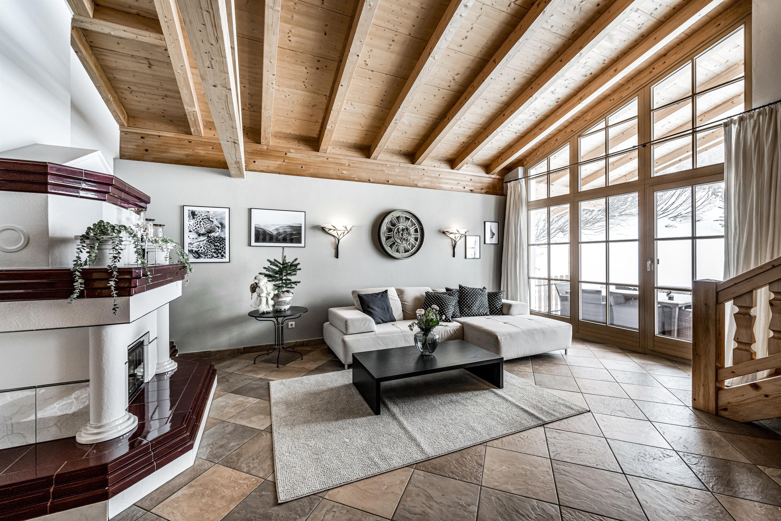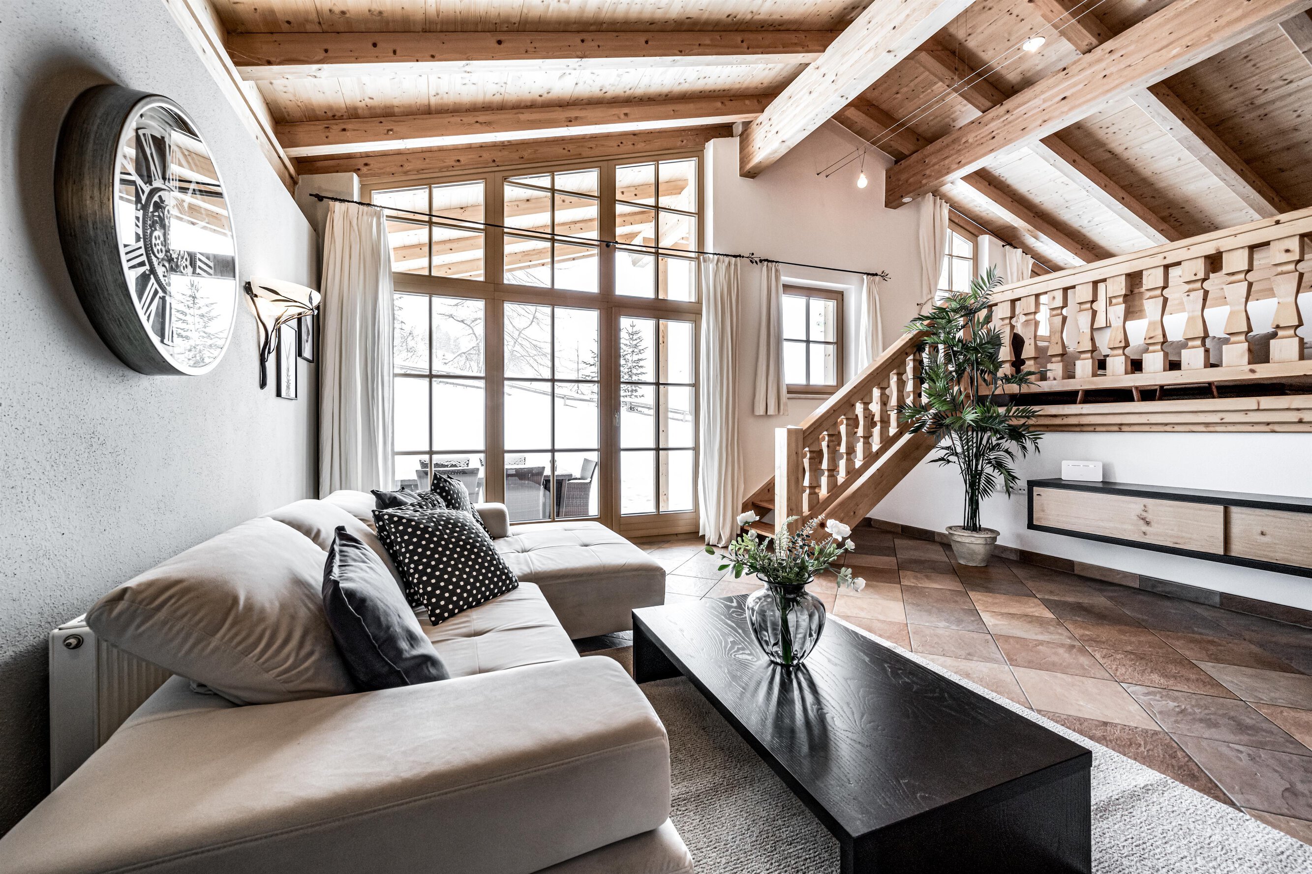 Der Aufenthaltsraum hat bequeme Sofas mit TV und eine gemütliche Stube mit weiteren Sitzgelegenheiten ist über ein paar Stufen erreichbar. Große Panoramafenster geben den Blick auf die Berge frei. Eine Treppe führt hinunter zum Essbereich und zur Küche.