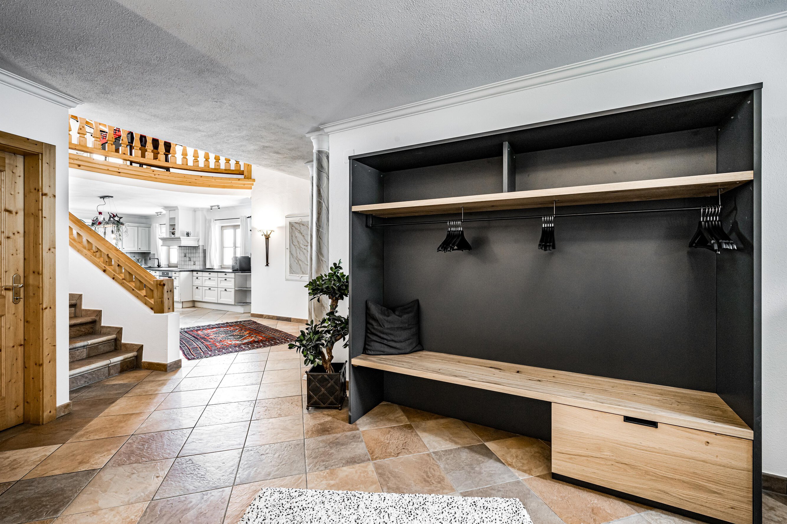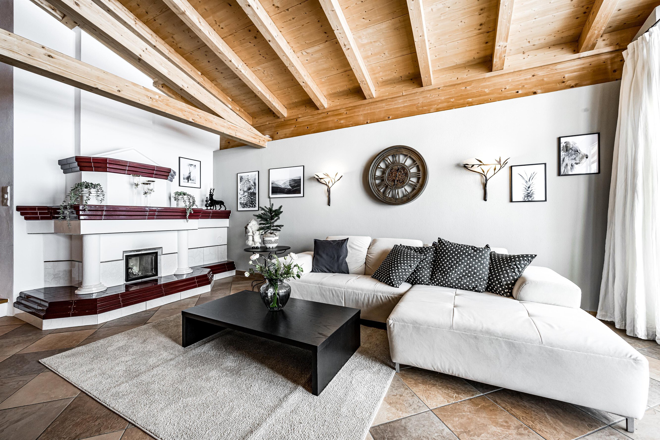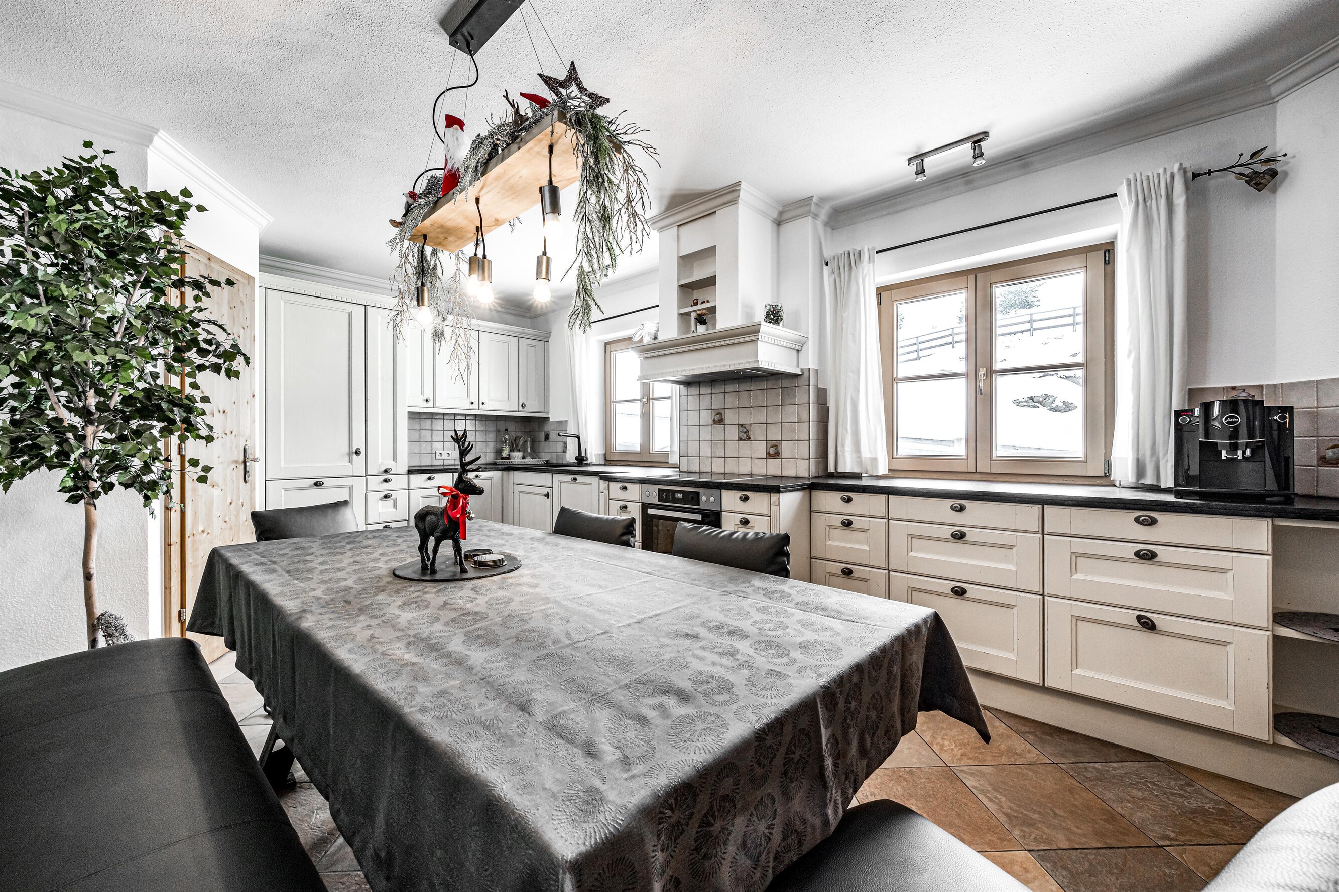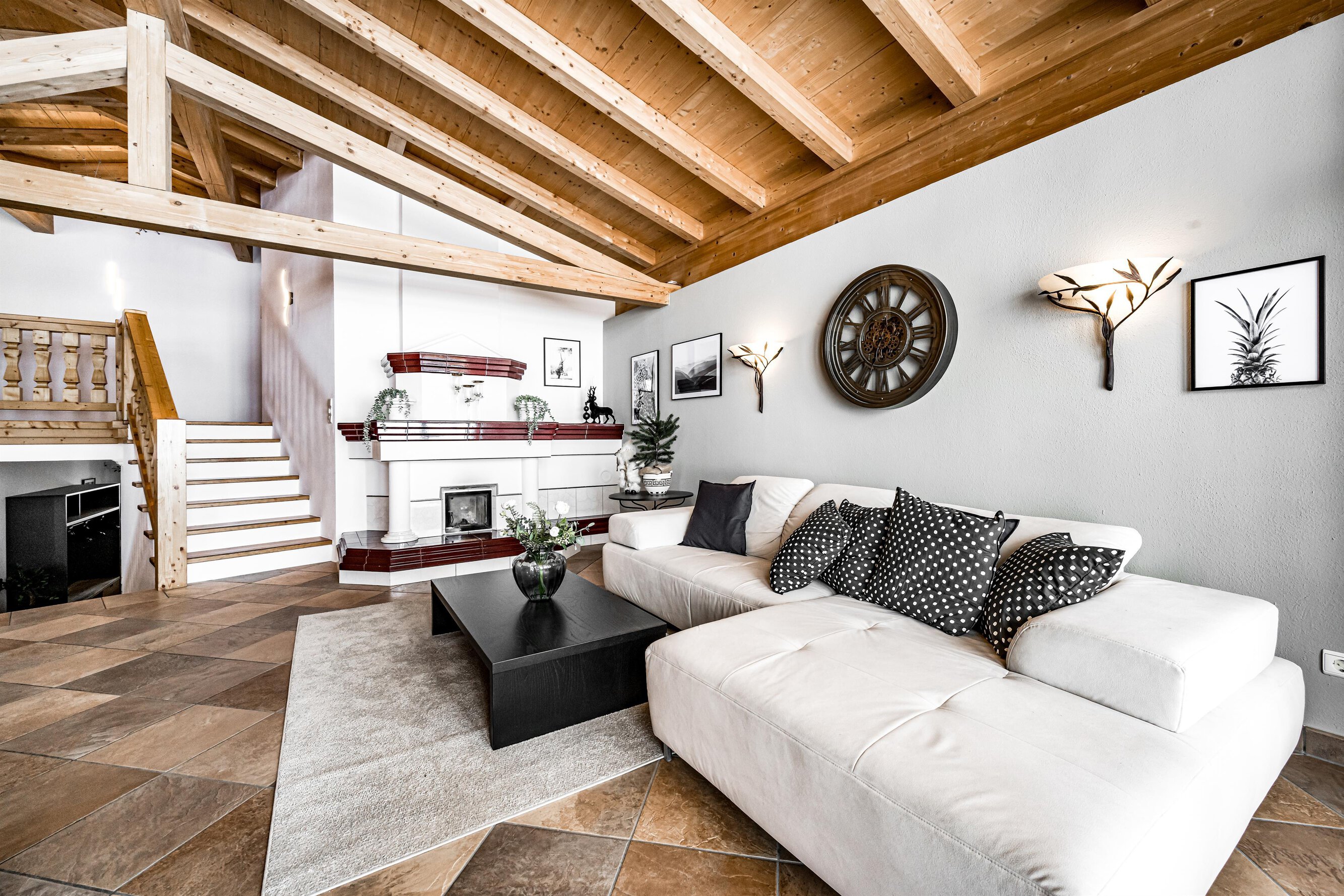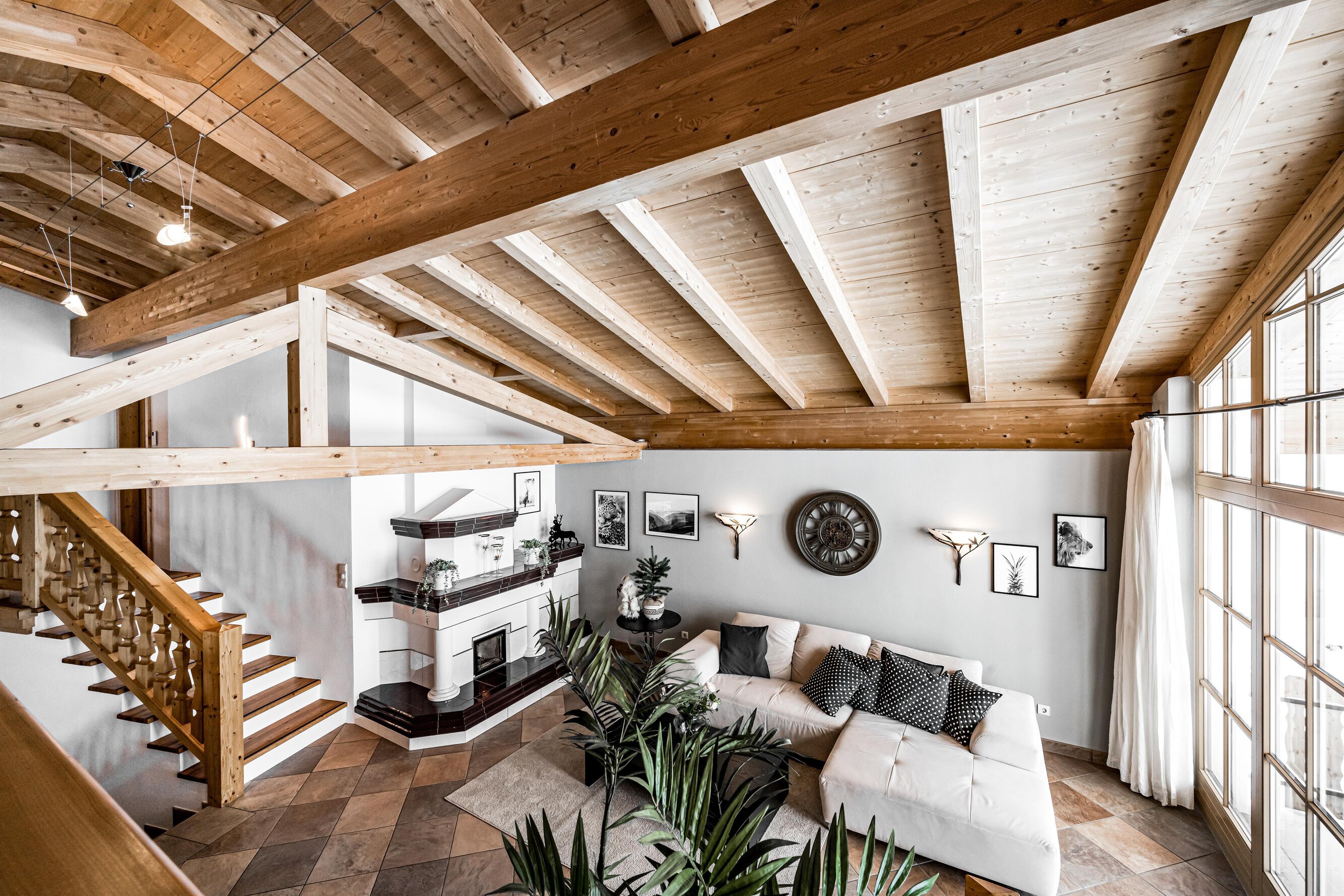 Der Aufenthaltsraum hat bequeme Sofas mit TV und eine gemütliche Stube mit weiteren Sitzgelegenheiten ist über ein paar Stufen erreichbar. Große Panoramafenster geben den Blick auf die Berge frei. Eine Treppe führt hinunter zum Essbereich und zur Küche.