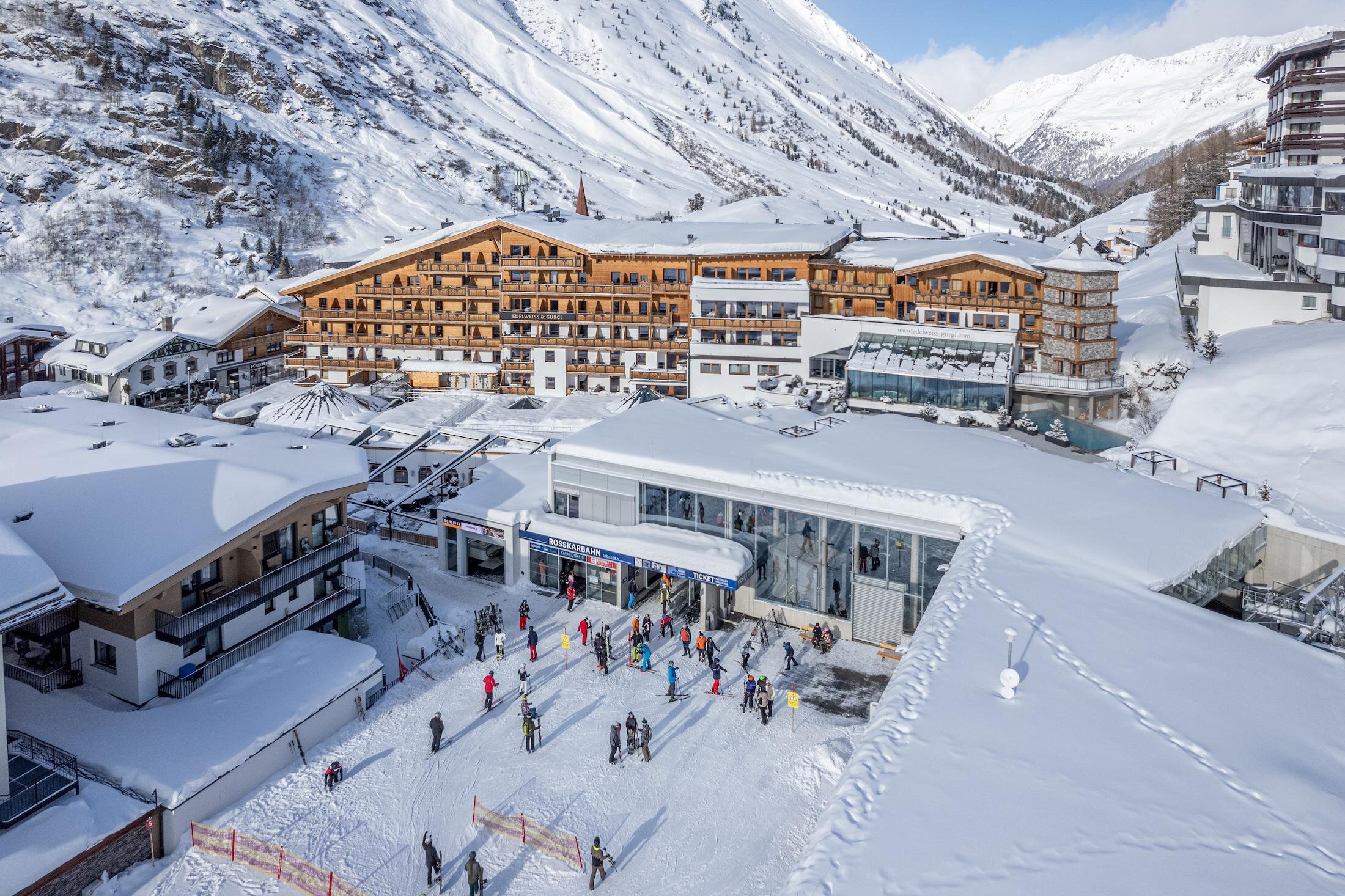 The traditional house with "glacier spa" in the most beautiful spot of Obergurgl. In the heart of the Ötztal Alps, in Obergurgl, the 4-star wellness and family hotel Edelweiss & Gurgl fulfills all your wishes for a dream vacation in Tyrol or in the Ötztal. For 4 generations, the Scheiber family has been pampering their guests. Whether family vacation, skiing holiday, wellness retreat, or horseback riding vacation - you are in the right place here. Located directly on the ski slope, you will experience true ski-in & ski-out service. A children's club with child care, as well as a modern sports shop and ski rental, are also located in the hotel.
